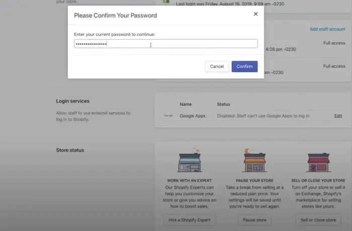 · enter your password · click confirm. Log in as the store owner. Log in to your shopify admin panel as the account owner to delete and close your shopify . · from your shopify admin, click settings, and then click plan and permissions or account. Click cancel subscription or pause or deactivate store.