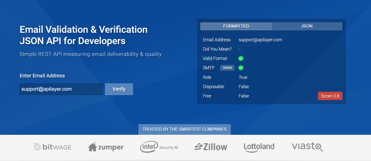 Validate email addresses at the point of entry with byteplant's email verification api. Mailboxlayer is an email verification and validation json api. The system enhances your list with useful information to help you get the most out of your email marketing. Simple and powerful email verification json api using smtp, typo checks, syntax validation, and free and disposable provider filtering. Deployed and trusted by 1000's of businesses.