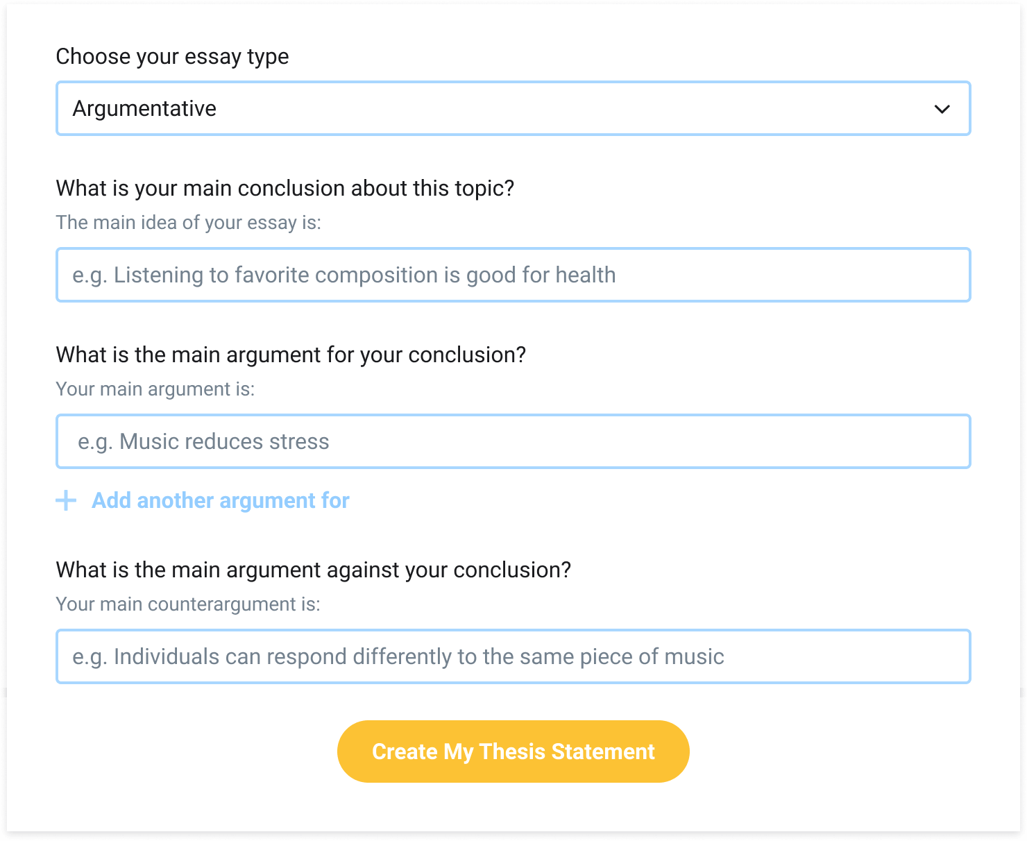 Argumentative thesis statement generator is designed to help you formulate the thesis for your future argumentative essay. No matter what essay topic you have been given, our essay generator will be able to complete your essay without any hassle. To write a good argumentative paper, a writer should gather the necessary evidence and choose the strongest arguments, related to a debatable problem or issue. An argumentative essay is a paper, which includes strong claims, convincing the audience. Provide academic inspiration and paragraphs to help you in writing essays and finding citations.