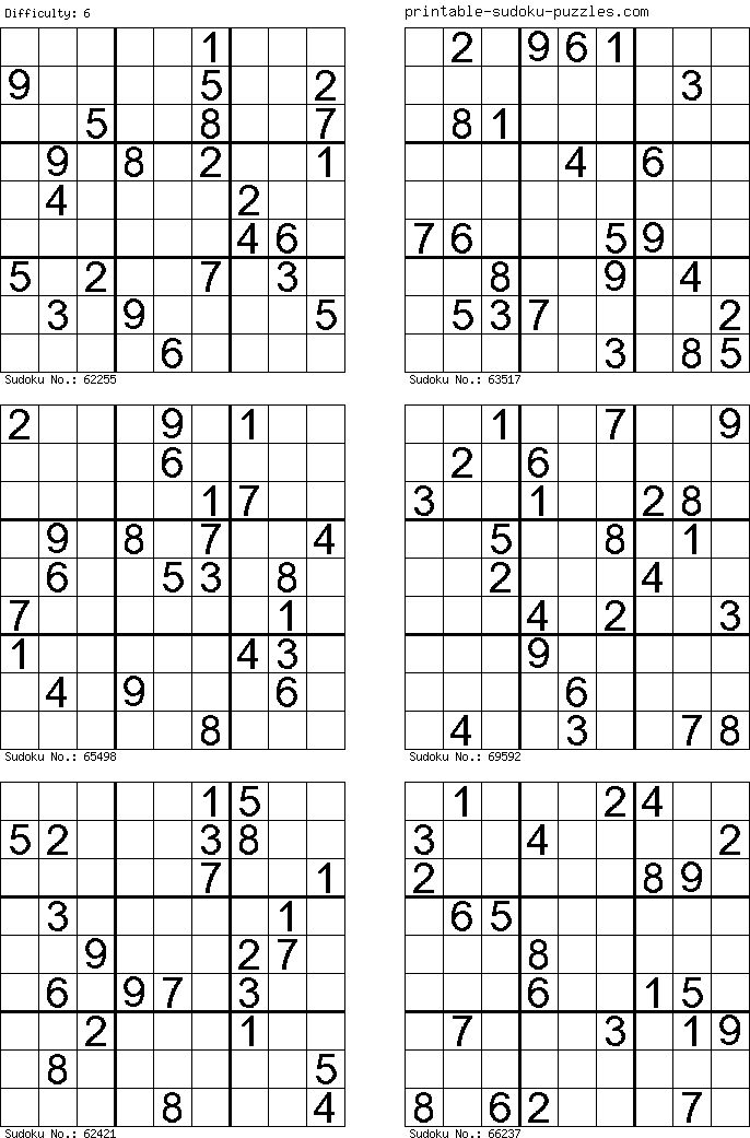 Printable sudoku 6 puzzles per page, in pdf or html, according to 5 levels: No need for a pencil with the best free online sudoku. Click print to start printing. Printable crossword puzzles, sudoku puzzles, logic puzzles, hard puzzles, challenging puzzles,. Challenge yourself with this free online version of classic sudoku. On this page are 100 free sudoku puzzles i made that you can print out right now. Well, then you will be happy to know . If you are an avid sudoku solver, it is difficult for you to stop at just one puzzle. Just click & print thousands of free sudoku puzzles 9x9. There's a new puzzle every day! Image or pdf, 6 sudokus per page. Today's puzzles plus a random puzzle . Easy puzzles #6 · easy puzzles #3.